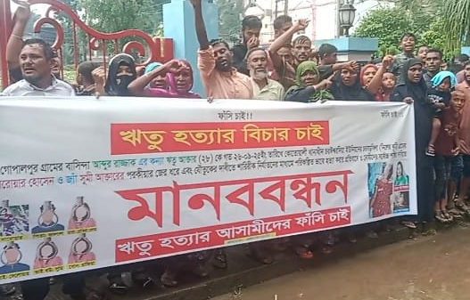 যৌতুক ও পরকিয়ার কারণে ময়মনসিংহ সদর উপজেলার চরঈশ্বরদিয়া চরবড়বিলা এলাকায় পরিকল্পিতভাবে গৃহবধূ ঋতু আক্তার (২৮) কে হত্যা করা হয়েছে। এ ঘটনায় বিক্ষোভ মিছিল ও মানববন্ধন কর্মসূচি পালন করে দৃষ্টান্তমূলক শাস্তি