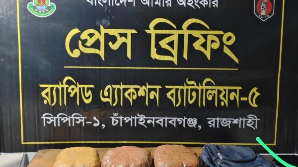 অভিনব কায়দায় গাঁজা বহনকালে মাদকদ্রব্য গাঁজাসহ ১ জন মাদক ব্যবসায়ীকে গ্রেফতার করেছে র‍্যাব-৫, সিপিসি-১ বাংলাদেশ পুলিশ কোম্পানী কমান্ডারের কার্যালয় সিপিসি-১, চাঁপাইনবাবগঞ্জ ক্যাম্প র‍্যাব-৫, রাজশাহী। তারিখঃ ০৫ অক্টোবর ২০২৫ খ্রিঃ। বিশেষ