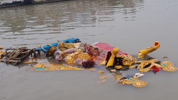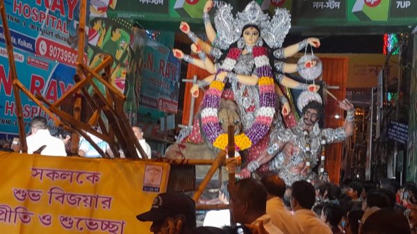 হাজারো শঙ্খর ধ্বনি ও প্রদীপের আলোয়  বিতর্কিত পুজোর– প্রতিমার নিরঞ্জন শোভাযাত্রা।