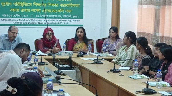 বটিয়াঘাটায় দুর্যোগ পরিস্থিতিতে শিশুদের শিক্ষার এ্যাডভোকেসি সভা অনুষ্ঠিত বটিয়াঘাটায় জাগ্রত যুব সংস্থা (জেজেএস) এর আয়োজনে স্থানীয় সরকার ও শিক্ষা অফিসের সহযোগিতায় দুর্যোগ পরিস্থিতিতে শিশুদের শিক্ষার ধারাবাহিকতা বজায় রাখার লক্ষ্যে