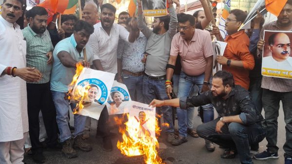 তৃণমূল কর্মীরা রবীন্দ্রনাথের ছবি পোড়ানয়-বিজেপি কর্মীরা রাস্তা অবরোধ করে ধিক্কার জানালেন ১০ই সেপ্টেম্বর বুধবার, ঠিক বিকেল তিনটায়, ভারতীয় জনতা পার্টির সদস্যরা ও সুবোধ সরকারের উদ্যোগে মুরলীধরে অবস্থিত, বিজেপির পার্টি অফিসের