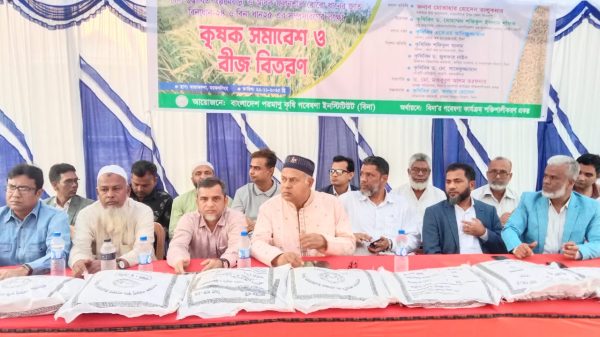 তারাকান্দায় কৃষক সমাবেশ ও ধানের বীজ বিতরণ ময়মনসিংহের তারাকান্দায় বিনা উদ্ভাবিত স্বল্পমেয়াদী ও অধিক ফলনশীল বোরো ধানের জাত বিনাধান-২৪ ও বিনা ধান ২৫ সম্প্রসারণের লক্ষে কৃষক সমাবেশ ও বীজ বিতরণ