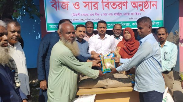 গাজীপুর জেলার কালিয়াকৈরে বিনামূল্যে কৃষকদের মাঝে সার ও বীজ বিতরণ করা হয়। বৃহস্পতিবার সকালে কালিয়াকৈর উপজেলা কৃষি প্রশিক্ষণ কেন্দ্রের সামনে এই প্রণোদনা বিতরণ করা হয়।২০২৫-২৬ অর্থবছরে রবি মৌসুমে কৃষি পূর্ণবাসন